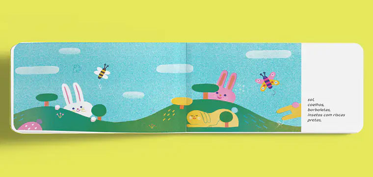 As ilustrações de Ana Seixas acompanham e amplificam esta dimensão sensorial. Predominam as cores vivas e luminosas, verdes, amarelos, rosas, que traduzem visualmente o rebentamento da natureza. As imagens não se limitam a ilustrar o texto: expandem-no, criando pequenos detalhes narrativos que convidam à observação demorada. É precisamente neste diálogo entre palavra e imagem que o livro ganha densidade estética. As guardas, iniciais e finais, padronizadas, funcionam como extensão do universo visual do livro, preparando o leitor para a entrada na estação e prolongando a experiência após o final. O quadriculado recorda-nos as sementeiras, aqui como metáfora da renovação, da esperança e do futuro.